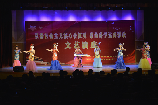6月12晚,学校和甘肃省反邪教协会联合举办以“弘扬社会主义核心价值观 崇尚科学 远离邪教”为主题的宣传演出活动。省委政法委副书记、省政府防范处理邪教办公室主任金祥明,省科学技术协会党组书记、第一副主席陈炳东,省政府防范处理邪教办公室副主任梁正伟和我校党委副书记刘玉泉等及相关职能部门负责人、各学院党委副书记、辅导员、学生共400余人观看演出。